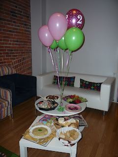 I served champagne with strawberries floating in it and a rose wine, along with a cheese platter, fruit platter, caprese salad toothpicks, cumin hummus and sushi. The kids enjoyed a variety of snacks along with little grilled cheese sandwiches cut out into mini hearts and stars with Sydney's playdough cookie cutters!