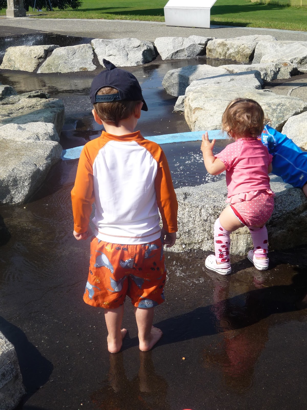 All of the kids were so funny at the park, not one of them got even a drop of water on them. They in fact weren't interested in the water at all! All they wanted to do was run around the perimeter of the water park or run towards the swings and playground. We hadn't been there five minutes, when poor little Weston fell and gashed his elbow open.
