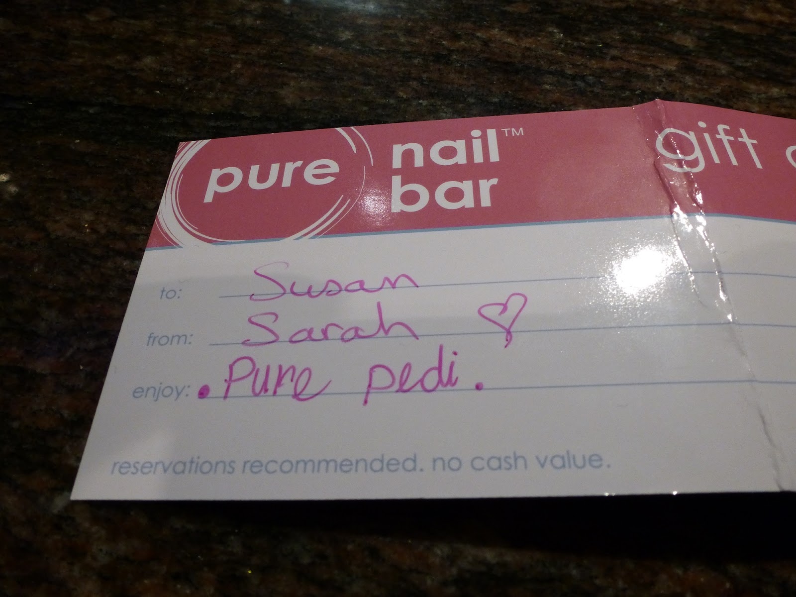 Sarah gave me such a thoughtful gift, a gift certificate for a pedicure. I am so looking forward to using it and spending an entire morning relaxing getting my toes done!
