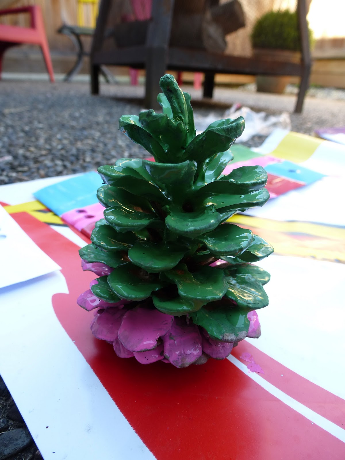 On the way walking back home Sydney and I collected a bucket of huge pine cones. Syd had the best time playing with them in her sand table and then decided that she wanted to paint them so we hauled her splash mat and paints out into the back yard and sat and painted in the sun. Such fun!